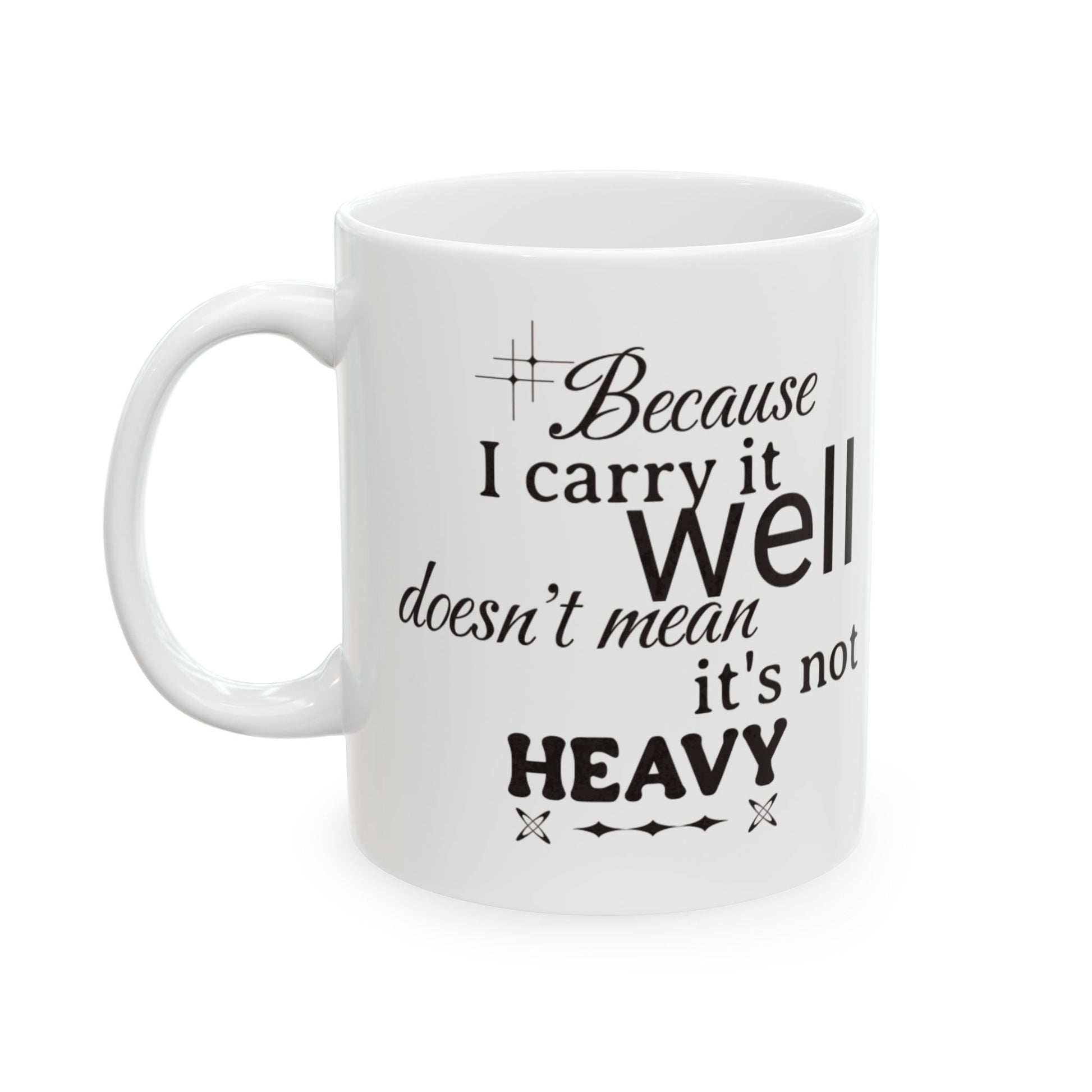 A ceramic mug available in both 11oz and 15oz sizes, featuring the quote 'Because I carry it well doesn’t mean it’s not heavy'. Thoughtful gifts for friends, family, and coworkers, serving as self-care reminders. Perfect for enjoying your favorite hot beverages and adding some inspiration to your daily routine. Relevant for birthdays, friendship celebrations, and self-care days.