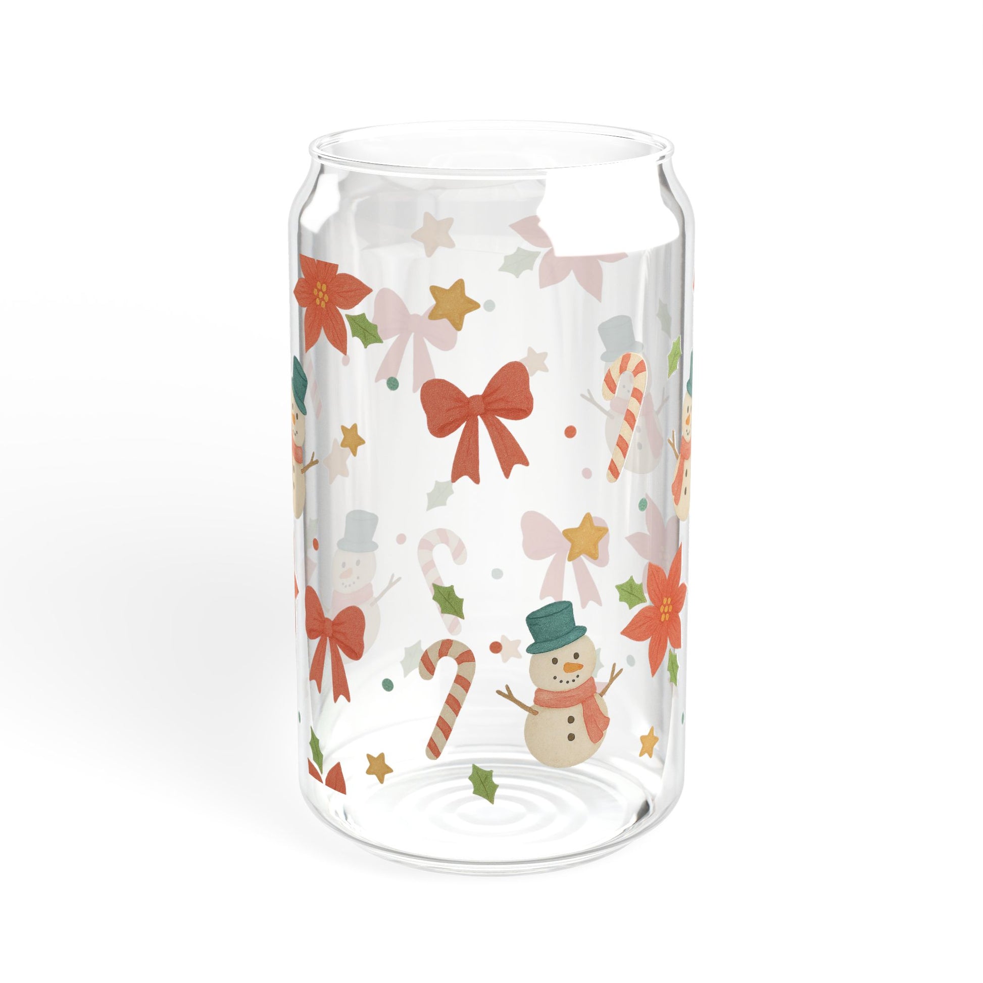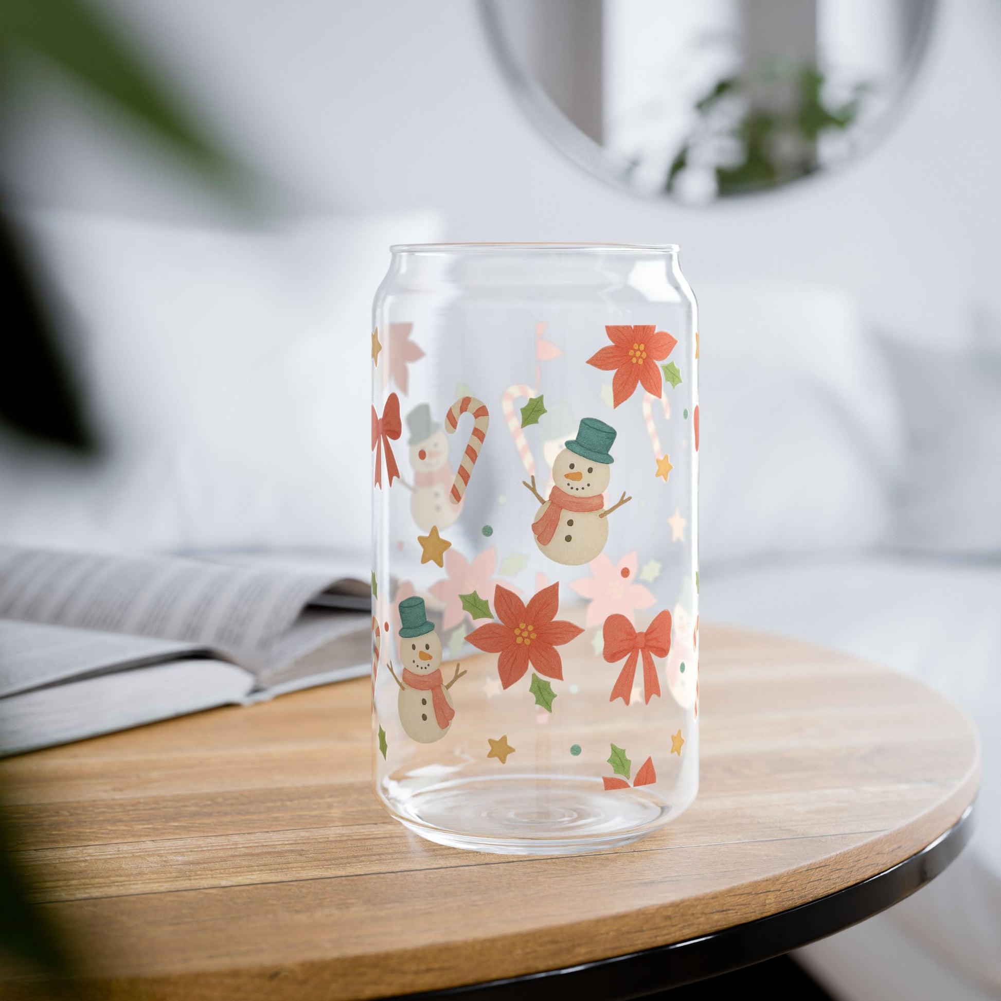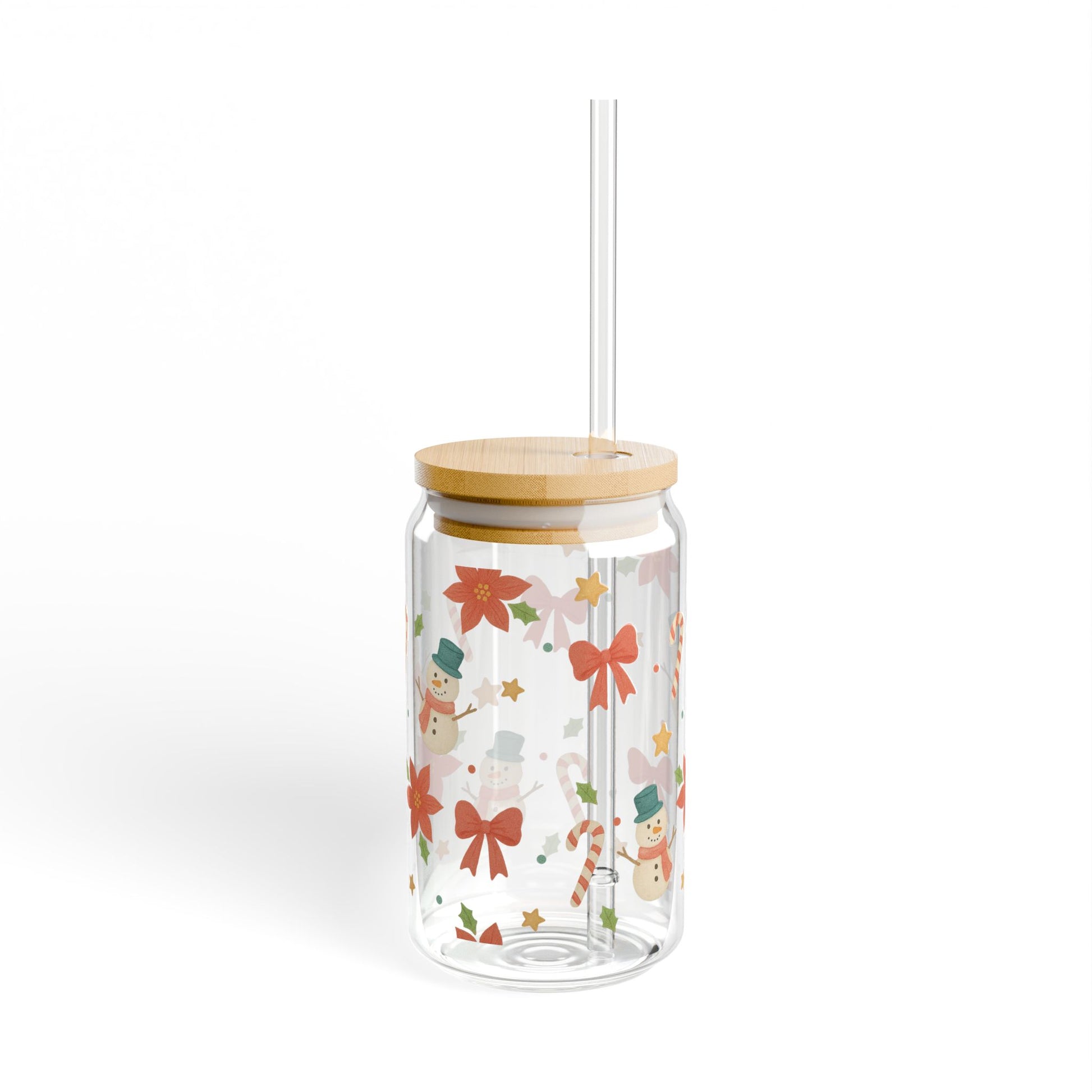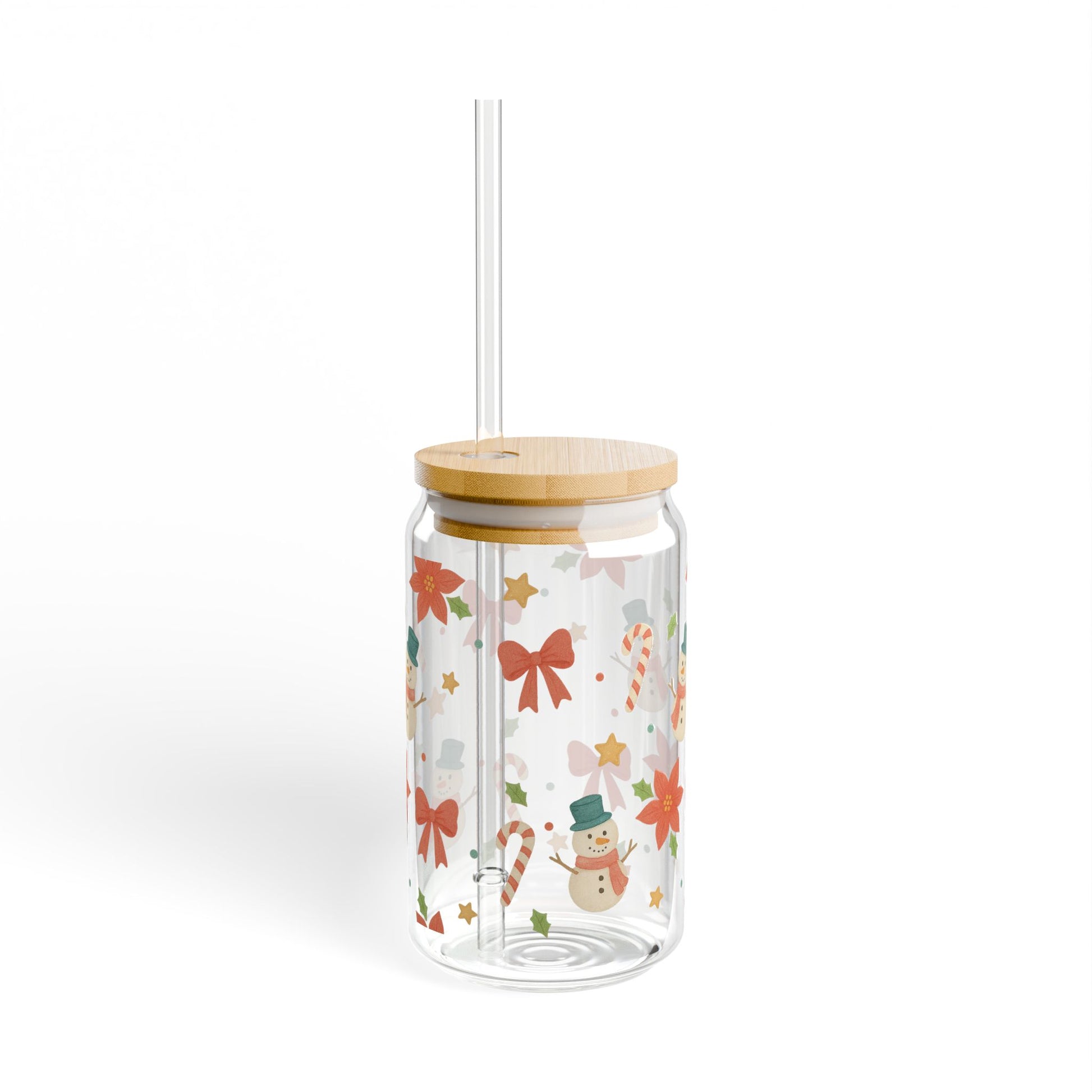 This 16 oz sipper glass brings winter cheer to everyday sipping. Cheerful snowmen, candy canes, and poinsettia blooms wrap the clear glass in bright, festive color that holds up through the season. The tempered glass feels weighty and smooth in hand, while the option of a bamboo push-gasket lid and durable Tritan straw makes it easy to take your favorite drink on the go. The printed artwork stays vivid thanks to modern printing methods, and the BPA-free materials offer peace of mind for family use. Hand wash keeps the finish looking its best and the glass made in the USA adds a small, thoughtful touch to every cozy morning and evening ritual.